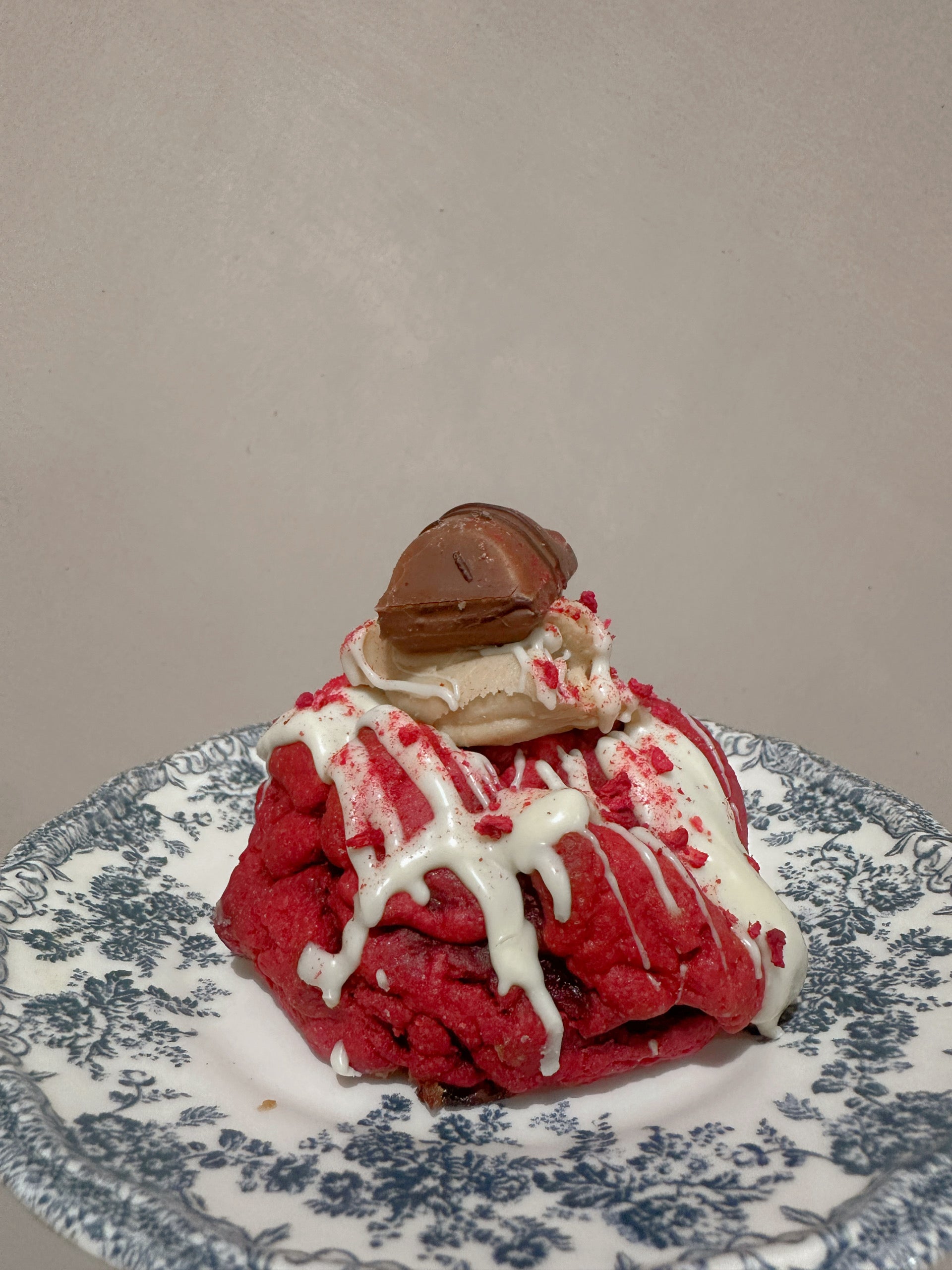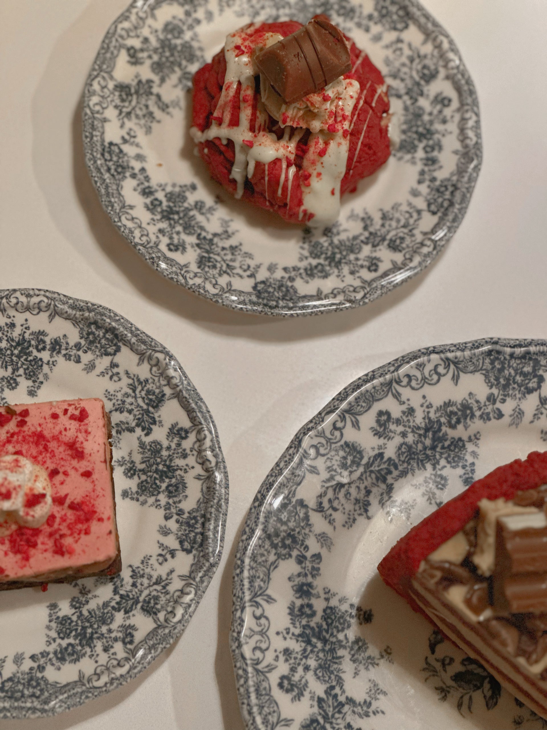 a red velvet, biscoff and cheesecake cookie, red velvet Bueno cookie, millionaires brownie, white chocolate and raspberry brownie, show-stopping red velvet Kinder pie, plus two adorable love heart brownies (white chocolate brownie and red velvet raspberry)